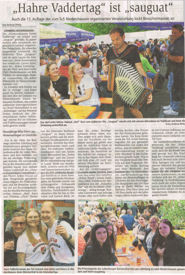 Weit mehr als 1200 Besucher konnte der TuS Niedershausen auf dem Hahre Vaddertag 2025 begrüßen. Bei herrlichem Wetter und toller Stimmung mit der Südtiroler Band Sauguat und DJ Geib konnte der